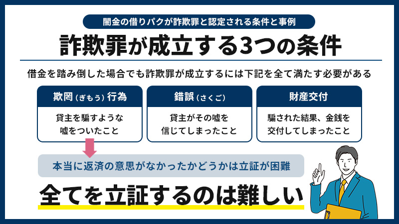 闇金からの借金を踏み倒した場合でも、詐欺罪が成立するには以下の3つの法的条件をすべて満たす必要があります。